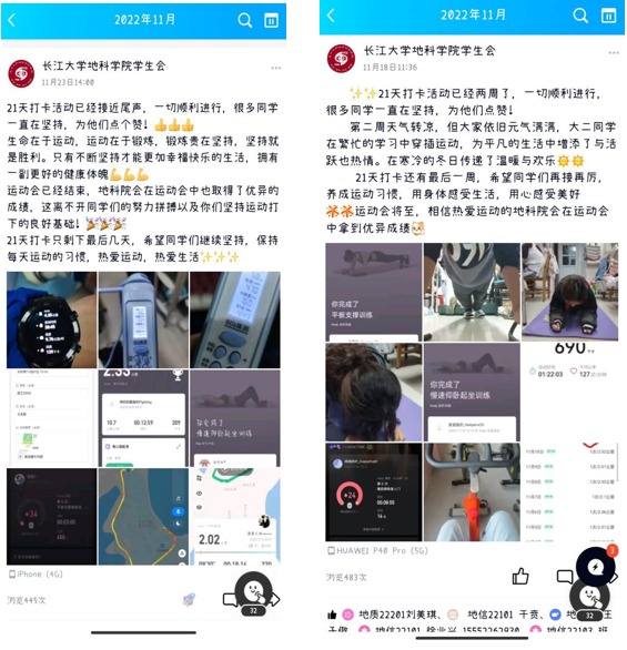 为扩大活动效果,展示同学们的运动风采,公司每三天在官Q空间发布活动进度,展示大家精彩运动瞬间和运动成果,并邀请了公司运动达人资工(卓越)21901班陈星兆和地质(工程)22001班张睿两位同学,分享自己的运动计划和感悟,引导大家科学运动,坚持锻炼。