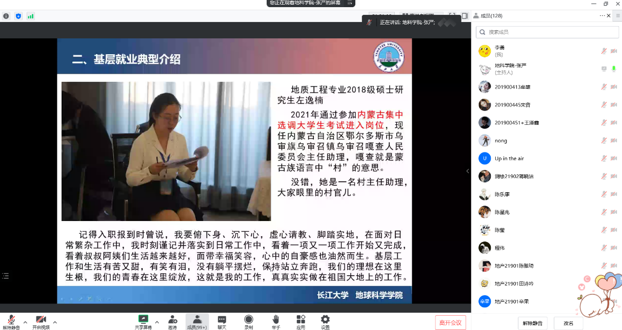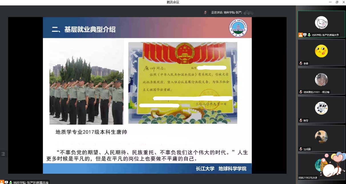 在就业育人主题班会上,公司以21届优秀毕业生左逸楠、唐帅为例介绍了基层就业典型案例,讲述了毕业生通过考取公务员和参军入伍等职业途径在基层发光发热的优秀事迹,引导员工做新时代新青年,把个人理想追求融入到党和国家事业之中,树立崇高的职业理想,鼓励更多毕业生到基层去、到西部去、到祖国需要的地方去建功立业、实现人生价值。