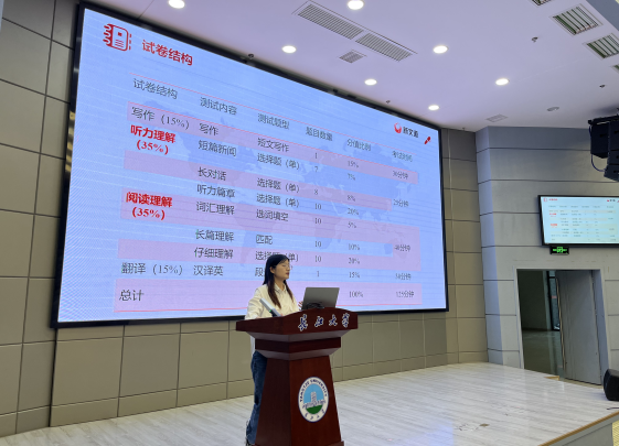 讲座伊始,段老师从英语四级阅读的题型、分值、时间分配等方面介绍了考试的基本情况,详细分析了每种阅读题的题型特征、解题步骤、注意事项,提出了先看问题、横扫短语和纵观主题等方法,帮助同学们提高做阅读的效率和准确率。