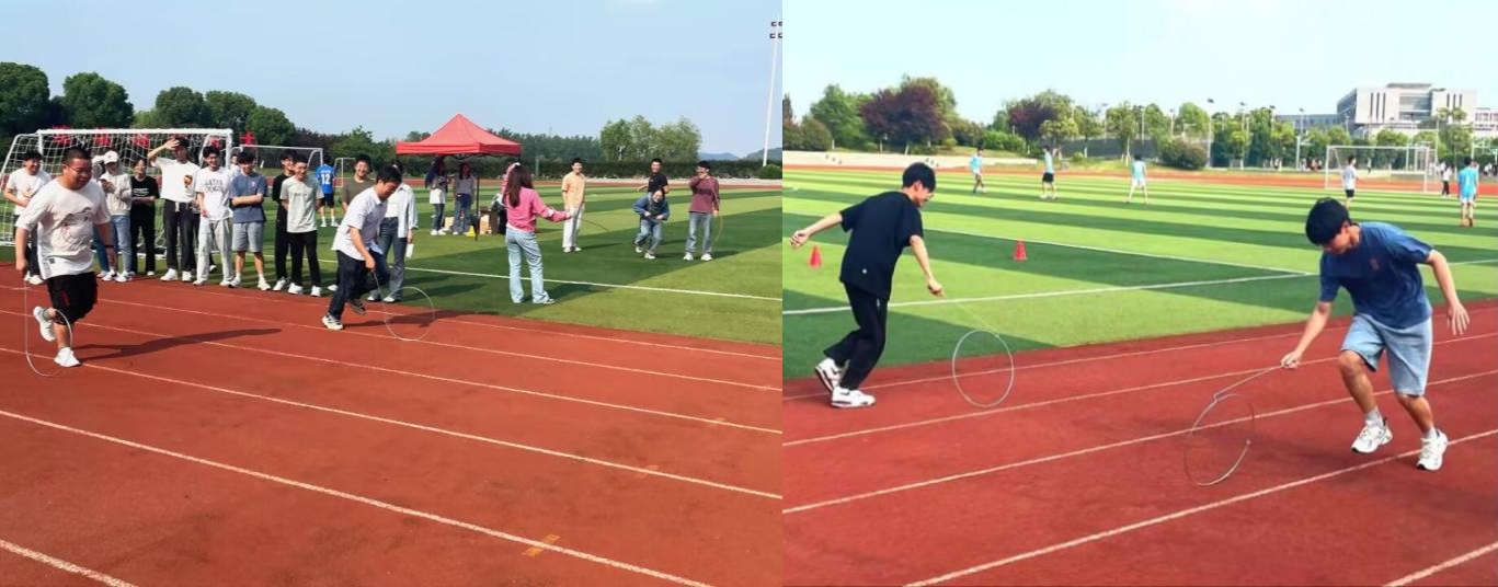 而在三人四足和五人跳大绳需要团队协作的比赛中,每个人都变得更加团结地合作着,一步三人,步步为营,三个人口中一起喊着“一二一,一二一”的口号,完美地呈现出节奏和配合的默契。在跳大绳比赛中,五个人一个接一个跳过大绳,跟着前一个人的节奏,向大绳中间跳去,一起沉浸在紧张又快乐的比赛中。观众也来到比赛场地旁边,为他们精彩的表现鼓掌,大声呼喊着“加油!加油!”,让比赛现场更充满了热情和动感。赛场内外都弥漫着一种欢愉和兴奋的气氛。无论是个人比赛还是团队比赛,每个人都全身心地投入其中,奋力拼搏,展现最好的自己。“平时很难有这样的机会可以和大家在操场上愉快的玩耍,感觉很放松,也很有趣。”与舍友一同参加三人四足项目的白硕同学如是说。这场精彩的运动会将给大家留下难忘的记忆,也让大家感受到了比赛和协作精神的力量。