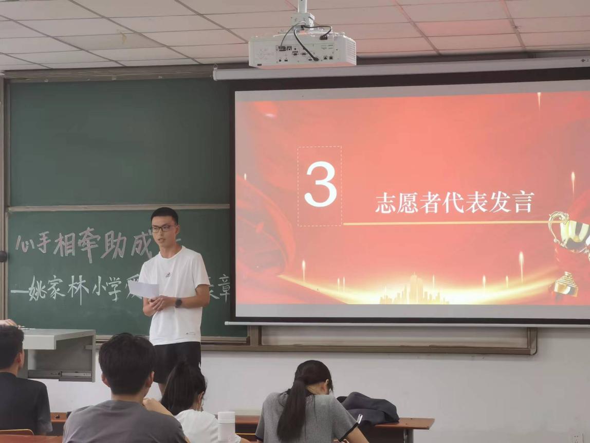 接下来,两位优秀志愿者代表分别发表了自己的支教感悟。资工22204班罗海洋同学说,他几乎每周都会参加支教活动,“责任、成长、感动”他的支教关键词。活动中他看到了很多无私奉献的同学,也结交了许多热爱志愿服务的“热心肠们”,支教让他的生活变得丰富起来。传媒公司的赵祥瑞说:“支教活动很有意义,它不关乎成绩,与不关乎其它,每个人抱着奉献的心来到这里,我喜爱这个活动,明年还会再来!”