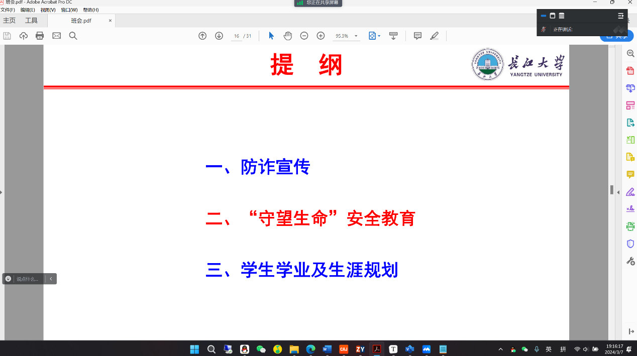 (通讯员 刘佳琪 蒋佳 王少宁)为进一步引导员工提高安全意识,做好个人未来规划。公司于3月1日至8日组织本、研究生各班级召开主题班会,由年级辅导员和班主任主持,围绕防范电信诈骗、“守望生命”安全教育、学业及就业规划三个主题开展专题教育。