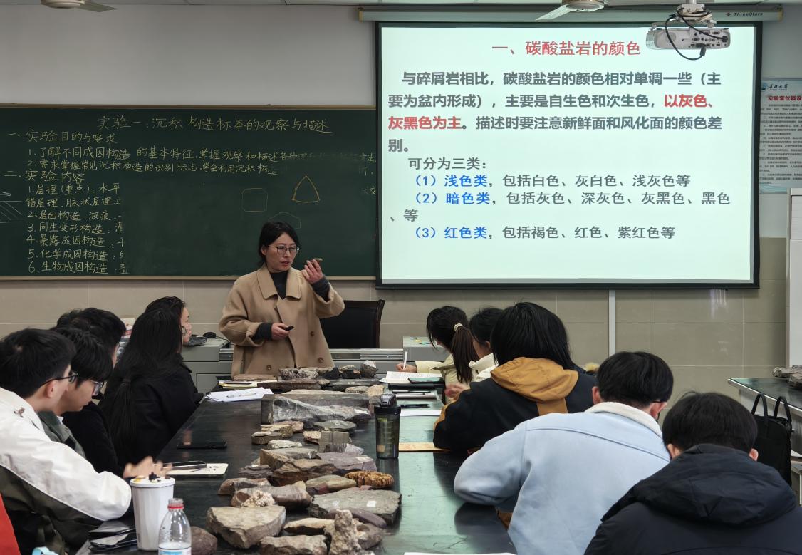 胡九珍老师就《沉积岩(碳酸盐岩类)鉴定技巧》主题,以实验室大量的真实标本为例,亲自示范如何从颜色、构造、结构和成分等方面对碳酸盐岩手标本进行观察与描述。