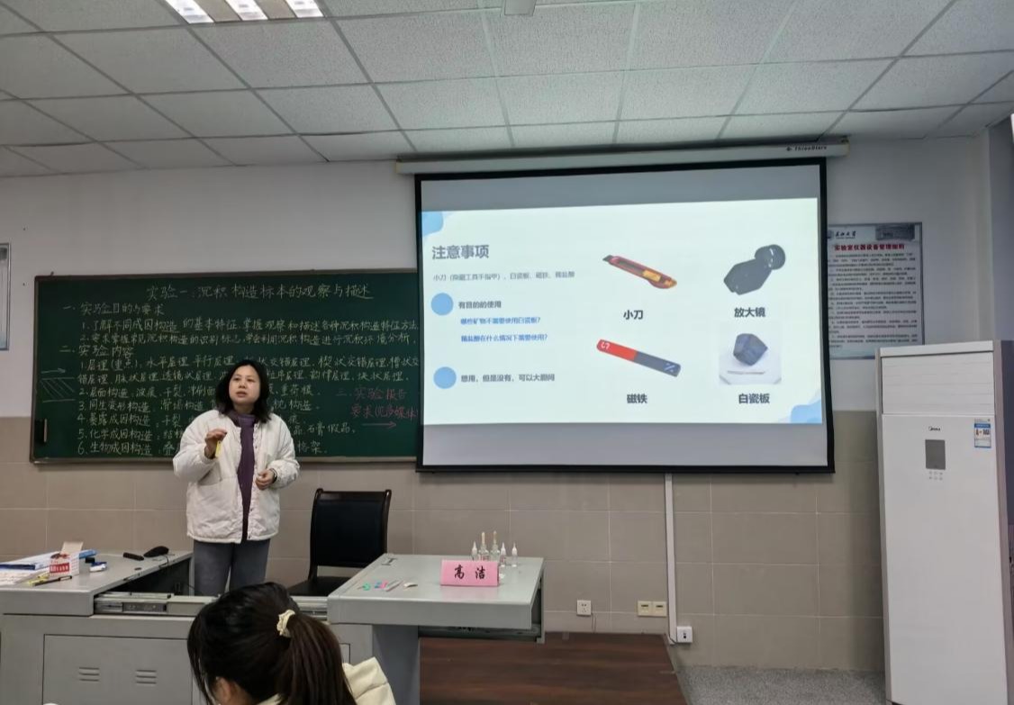 郭晋威老师以《岩浆岩和变质岩的鉴定要点》为例,讲述手标本描述的核心要素,带领同学们观察不同矿物颜色、速率和颗粒大小,归纳岩石的特征,生动讲解了常见岩浆岩与变质岩的鉴定技巧。
