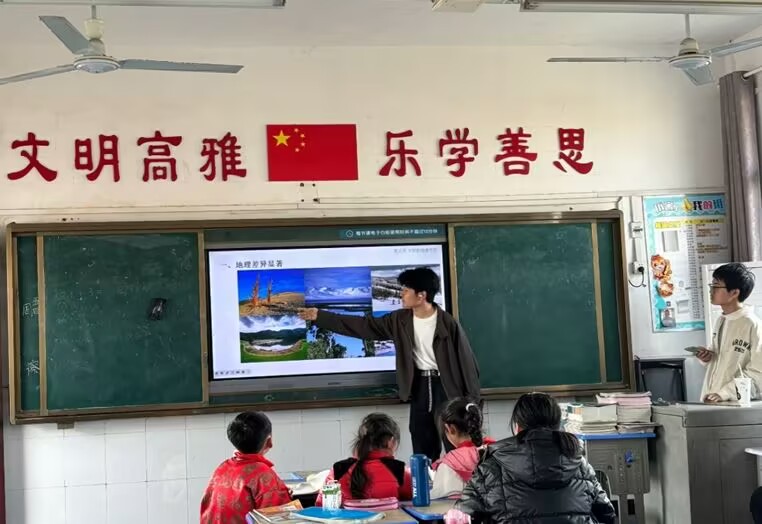 在“神奇地球”小课堂上,志愿者用生动形象的比喻讲解地球构造,把地壳比作“鸡蛋壳”,地幔比作“蛋白”,地核则是"蛋黄",让孩子们轻松理解抽象概念。在讲解中国气候时,志愿者用"庄稼地里的不同菜畦"来打比方——沿海地区就像"水稻田",总是湿漉漉的;西北地区好比"旱地瓜田",干得裂口子;青藏高原则像"冬天的大白菜地",常年盖着雪被子。在讲解中国河流时,志愿者化身"河流爷爷",给孩子们讲起了"水的旅行故事":"从前啊,长江哥哥和黄河弟弟从青藏高原的'冰雪城堡'出发。长江哥哥性子急,一路蹦蹦跳跳穿过峡谷;黄河弟弟走得慢,边走边玩泥沙,结果把自己都染黄啦!"这种寓教于乐的授课方式,让深奥的知识变得触手可及,不仅激发了孩子们的好奇心,更让教室变成了欢乐的乐园。
