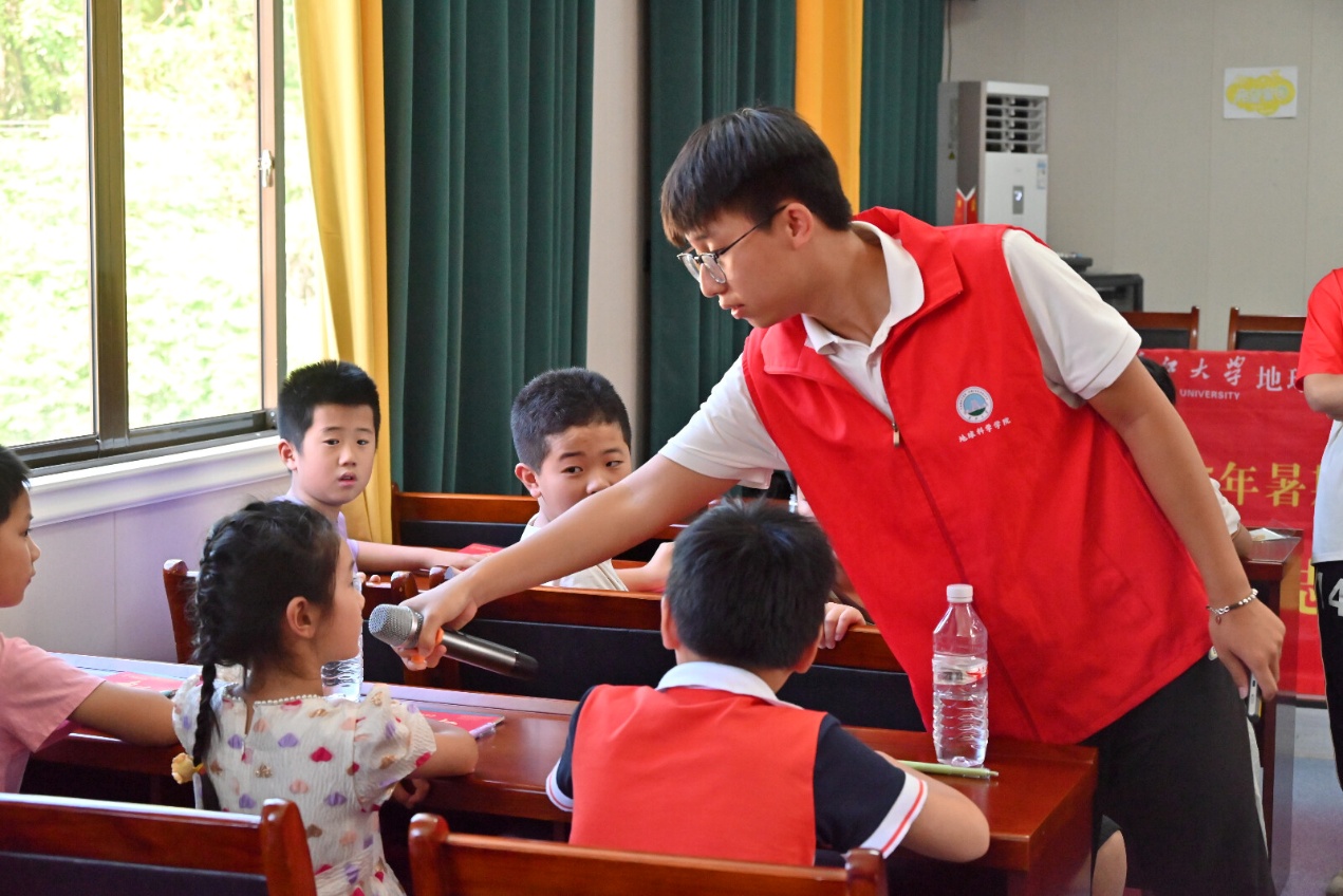 在会议室里,储思佳带领孩子们开启“地球探秘之旅”科普课程。他借助图片讲解地质历史时期存在过的不同古生物生存的地质年代和主要特征,与大家分享关于不同古生物的各种知识。储思佳还向同学们介绍道,坐落在太阳成tyc33455ccwww武汉校区的中国地层标本长廊就记录着中国大地20多亿年以来的浮沉和沧桑巨变。一位小朋友举手说道:“我知道,科学家们就是从地层中发现的那些化石的!”