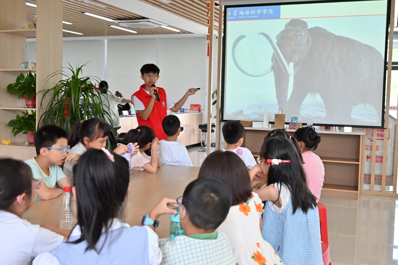 7月24日的“地球故事会”同样别出心裁。储思佳向同学们讲解了不同古生物的特点,并通过剑齿象与猛犸象化石图片对比,引导孩子们发现“剑齿象牙齿更长、更直”“猛犸象毛发更厚”等差异。