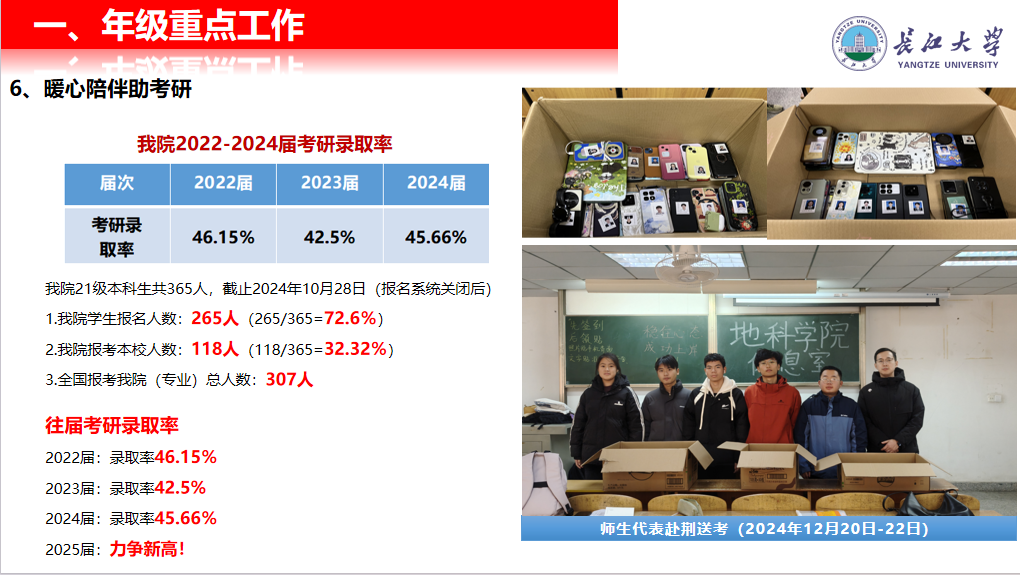 会议系统梳理了本学期多项关键安排,包括员工返校流程、毕业资格审核、毕业设计进度及各专业实习计划,提醒家长共同关注员工学业完成情况。针对考研升学,公司详细介绍了近年考研趋势、院内资源支持及重要时间节点,并展示了师生赴荆送考、考研送温暖等暖心举措,体现全程陪伴的育人理念。